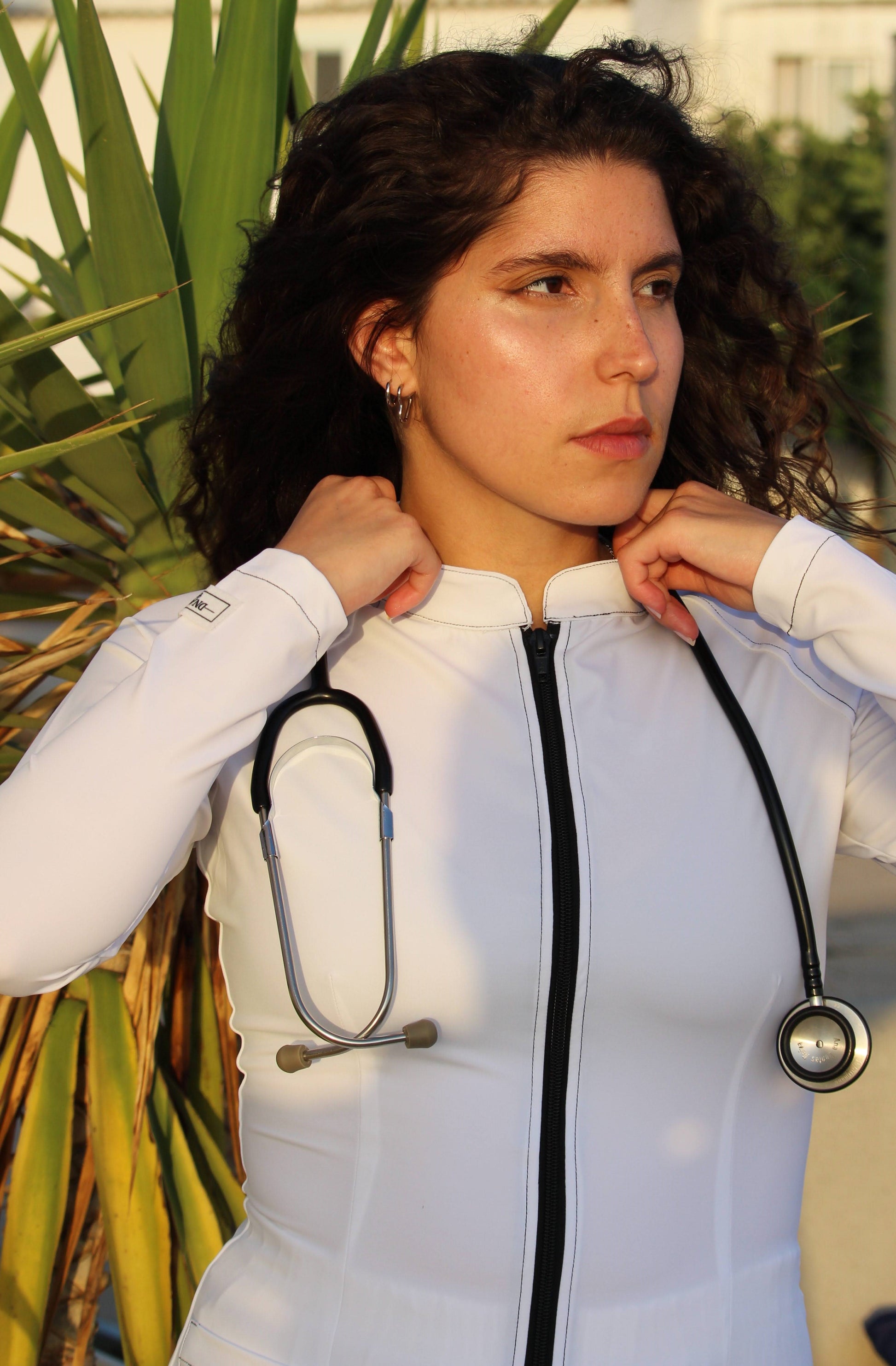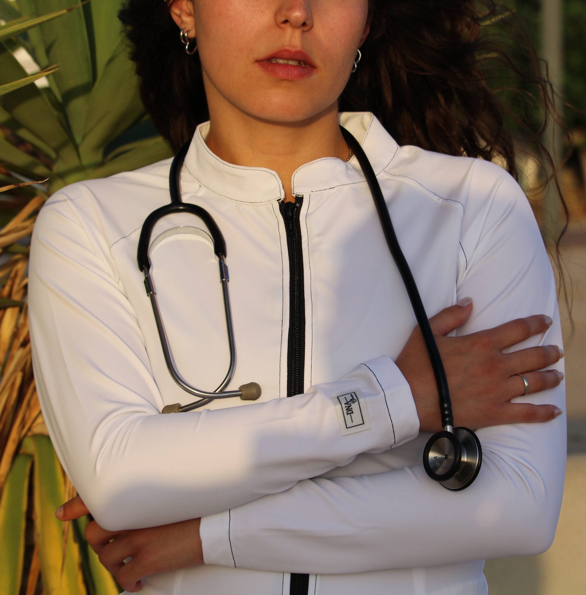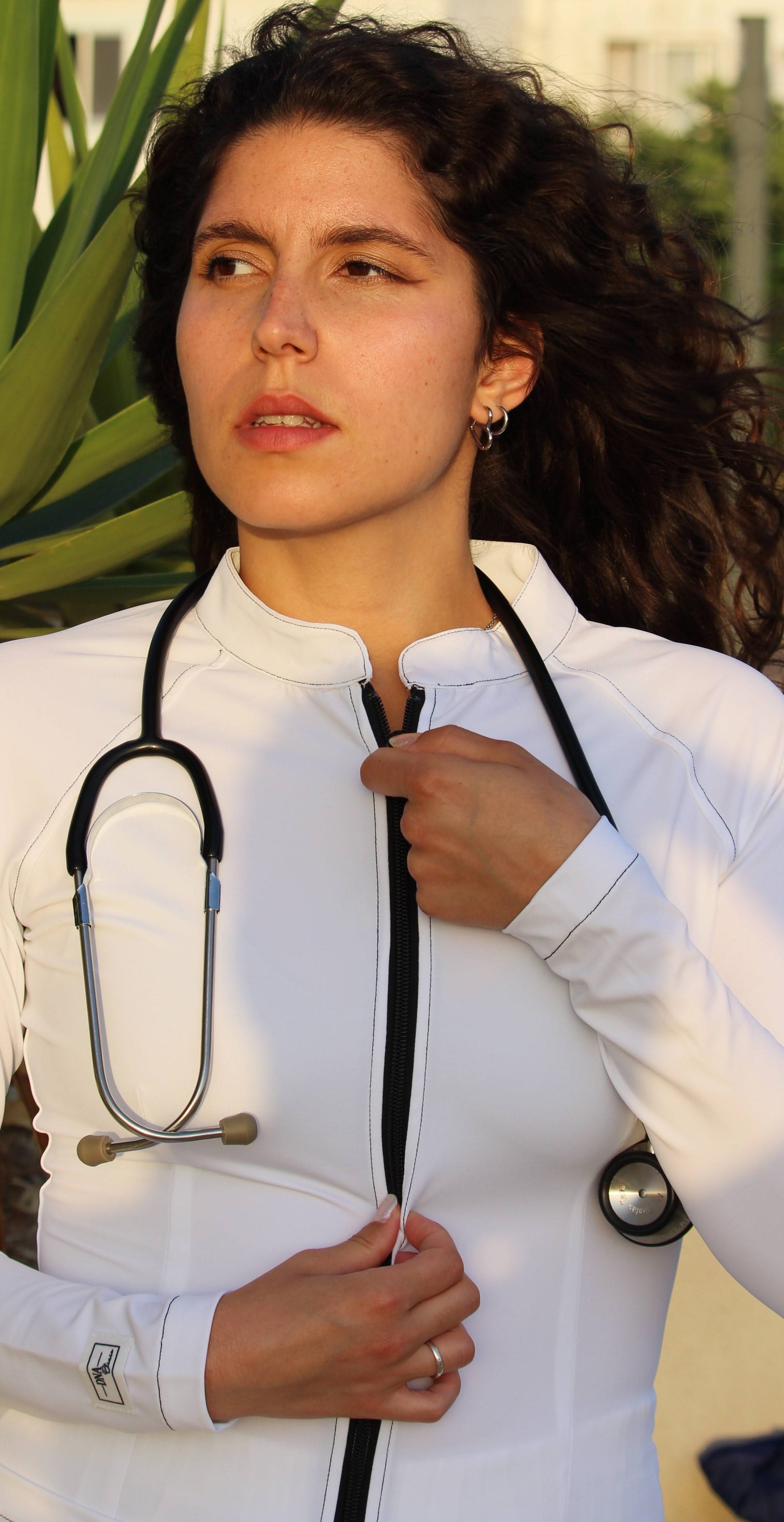 Pensando nas vastas horas que despendes a trabalhar criámos a bata Bianco Black de design exclusivo, nascida da união de beleza estética e confeção única com tecido desportivo com 22% de Elastano, resultando numa peça que realça a beleza individual dos(as) profissionais de saúde e estética, aliado ao máximo conforto.